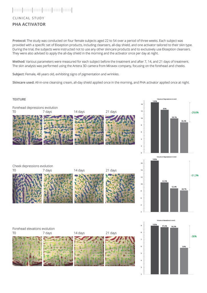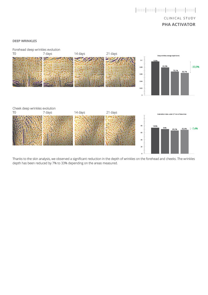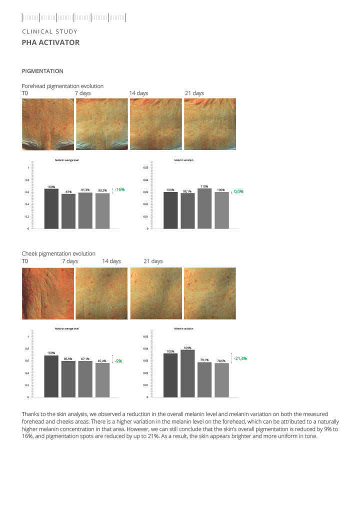 Poli-hidroxiacizii (PHA) și enzimele îmbunătățesc textura pielii și reduc ridurile, în timp ce acidul tranexamic și hexil-resorcinolul reduc problemele de pigmentare.