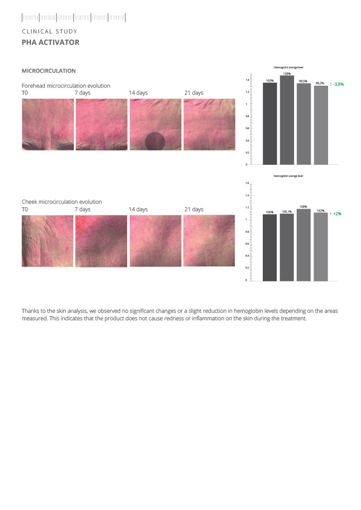 Acizii pe care îi conține sunt poli-hidroxiacizi (PHA), pentru a evita producerea inflamației și înroșirea pielii, după cum s-a demonstrat în studiul clinic, după 3 săptămâni de tratament.