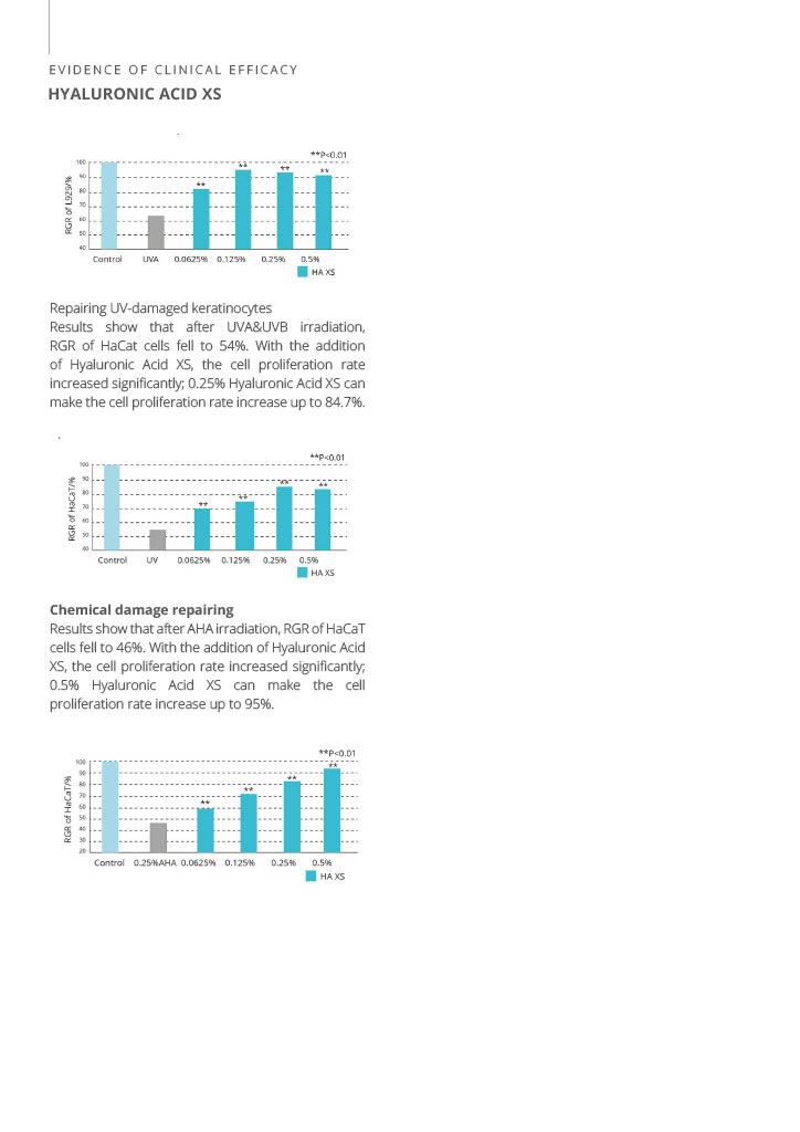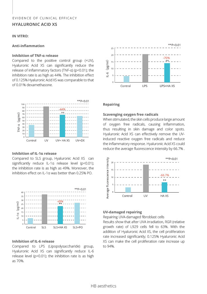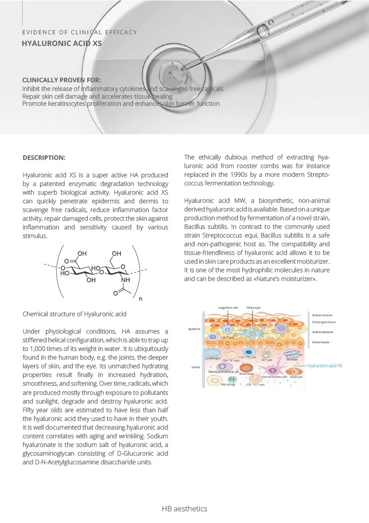 Conține acid hialuronic XS, o formă cu greutate moleculară foarte mică. Acidul hialuronic este cel mai hidratat biopolimer cunoscut. În țesuturile vii, servește ca organizator de țesut conjunctiv și ca substanță de reținere a apei. Hialuronatul de sodiu provine dintr-un proces biotehnic sigur; nu conține contaminanți și OMG. Este o descoperire în proprietățile anti-îmbătrânire, cu o permeabilitate crescută în piele, în comparație cu acidul hialuronic cu greutate moleculară mare. Întinerește pielea prin îmbunătățirea proprietăților sale vâscoelastice și scade semnificativ ridurile profunde.