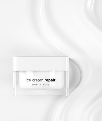 Cremă reparatoare ten uscat – Ice Cream Repair conține o cantitate importantă de nutrienți esențiali și factori de creștere pentru a stimula activitatea celulară și retinolul pentru a stimula procesul de reînnoire a pielii.