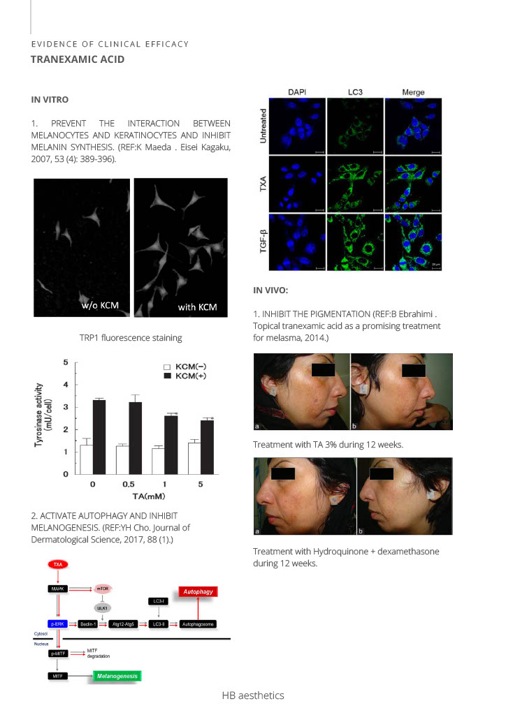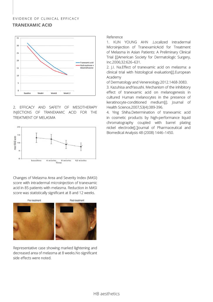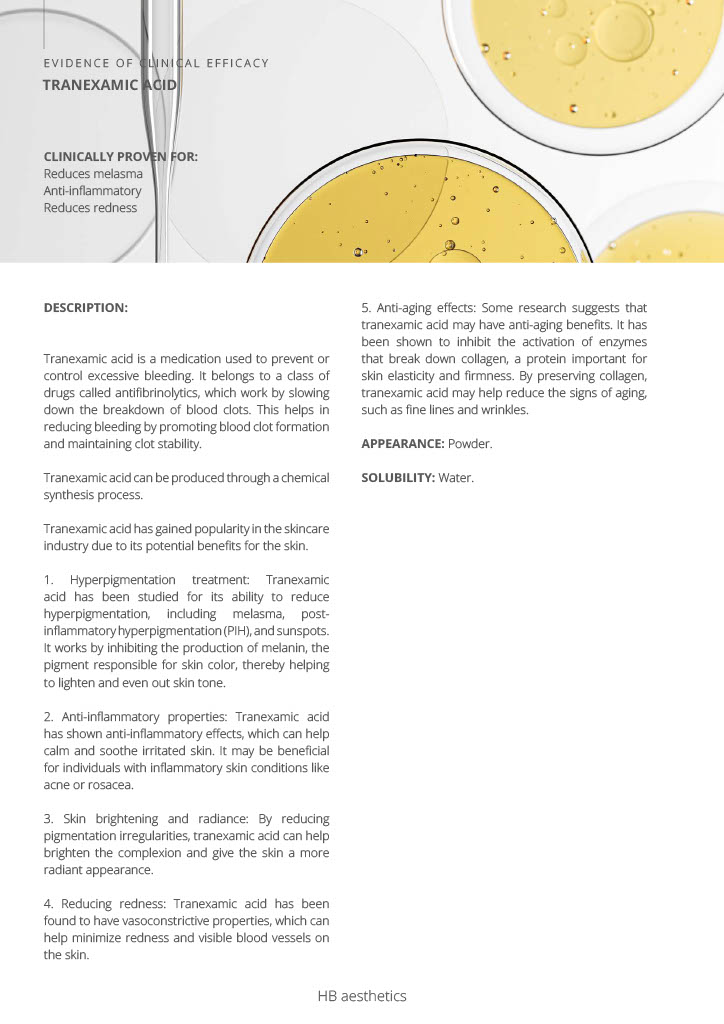 Acidul tranexamic este un derivat sintetic al lizinei cu o structură parțial similară cu cea a tirozinei. Confirmat prin studii clinice, are efect pentru toate tipurile de piele și poate elimina pigmentarea, îmbunătățește aspectul petelor pigmentare după expunerea la soare, petele pigmentare (cloasmă, pistrui, petele senile etc.), petele post-acnee și post-inflamatorii.