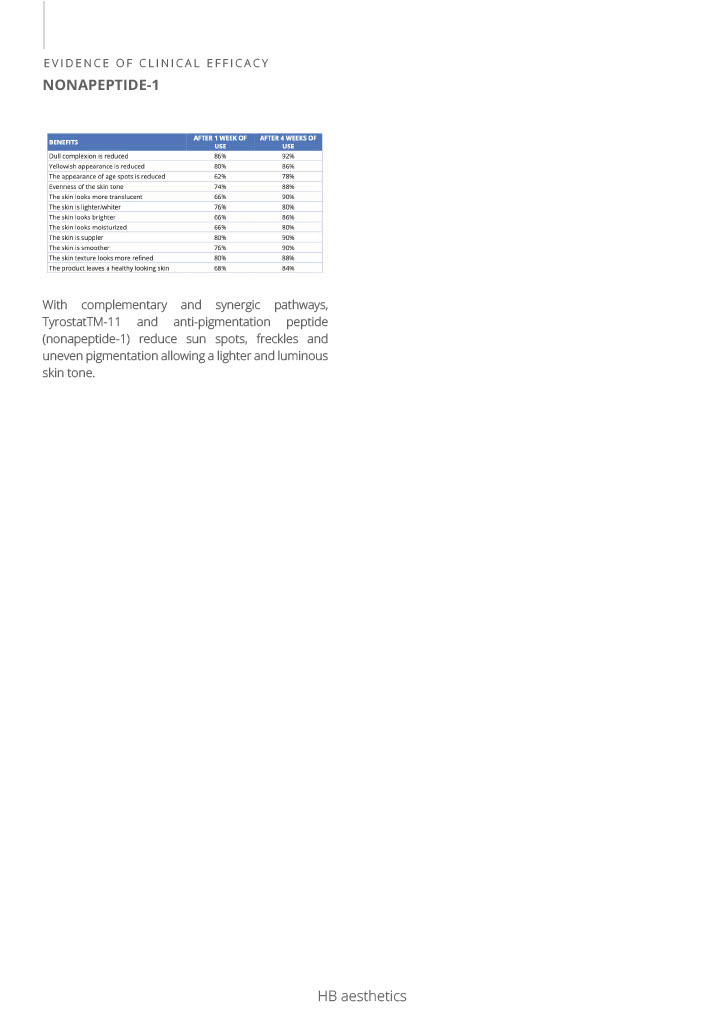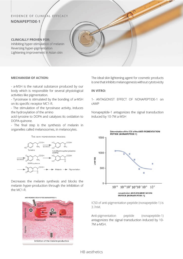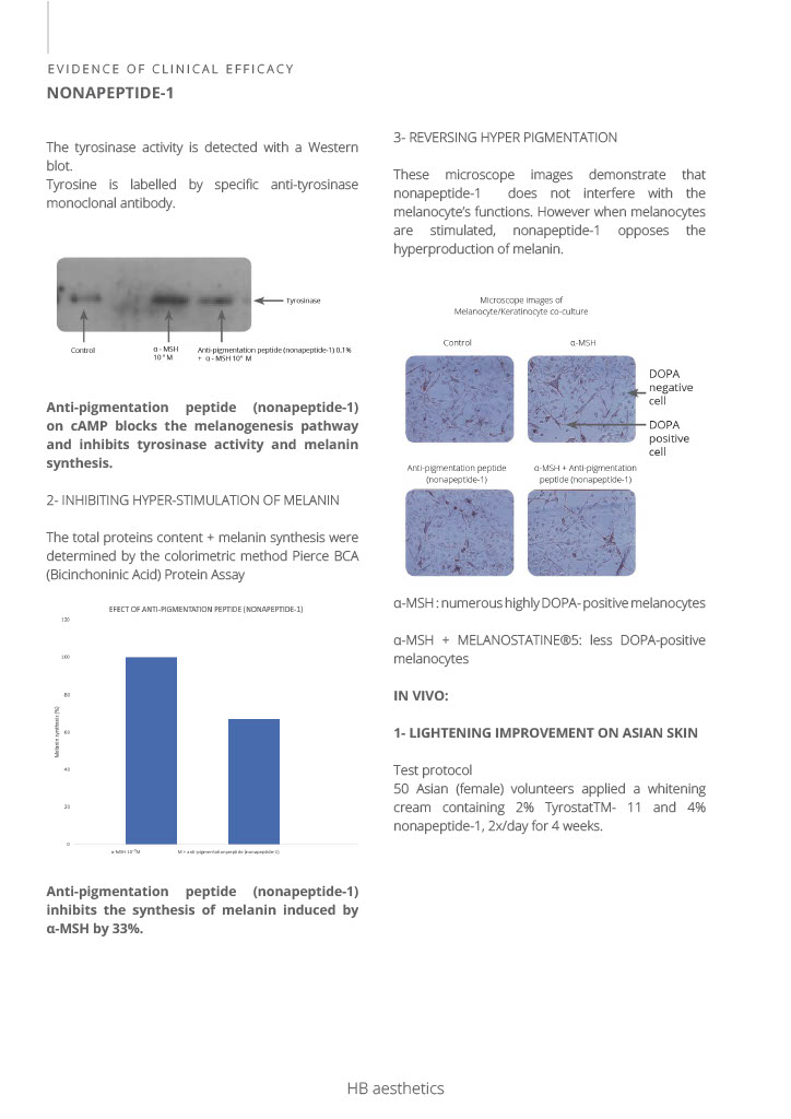 Nonapeptida-1,din compoziția produsului, previne pigmentarea nedorită, prin activarea tirozinazei, enzima care sitimulează formarea melaninei, permițând un control mai bun asupra nuanței pielii.